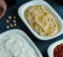 Greek salad, Tarama, Houmous, Tzatziki, Tahini CHIPS & RICE