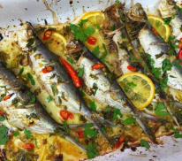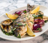 Sea bass, Salmon, Kalamari, King prawns, Scampi