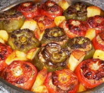 Stuffed tomatoes or peppers, with rice and mixed vegetables