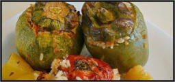 Stuffed tomatoes or peppers, with rice and mixed vegetables oven baked